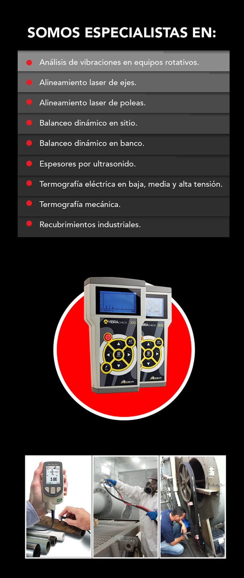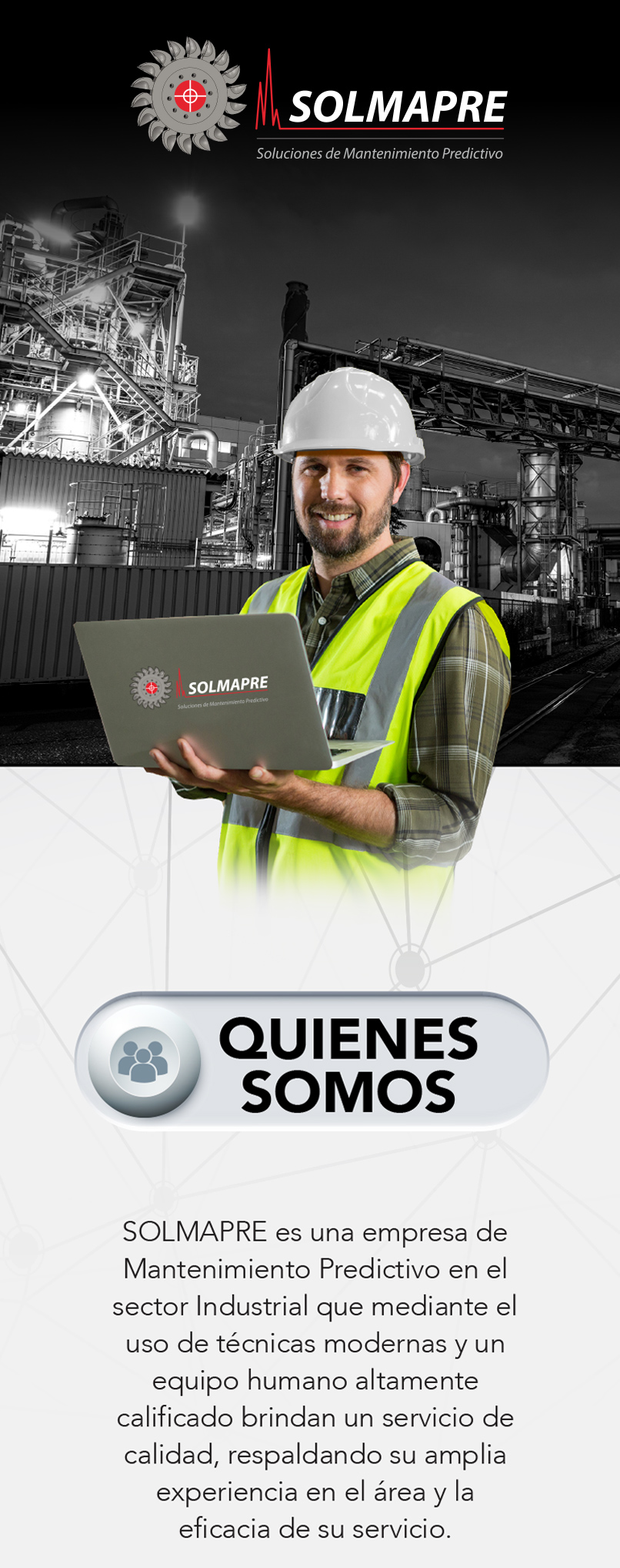 SOLMAPRE es una empresa de Mantenimiento Predictivo en el sector Industrial que mediante el uso de técnicas modernas y un equipo humano altamente calificado brindan un servicio de calidad, respaldando su amplia experiencia en el área y la eficacia de su servicio.